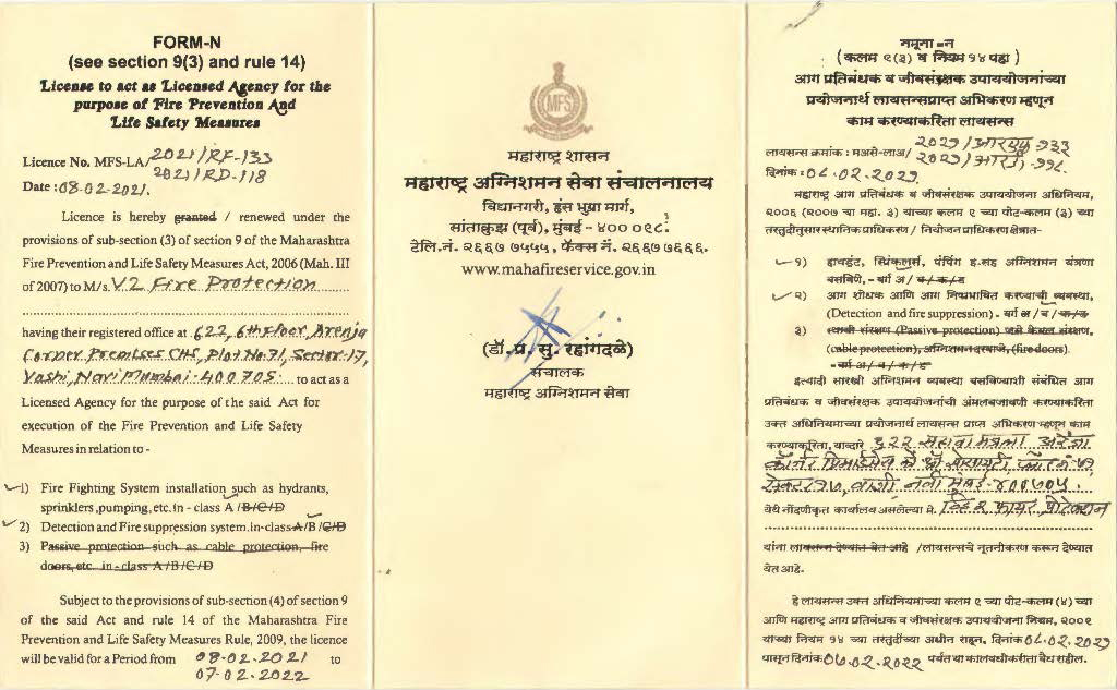 V2 Fire Protection established in 2006 is a Class A Licensing Agency certified by Maharashtra Fire Services for fire & safety engaged in designing, supplying, installing testing & commissioning all types of Fire Protection Systems on turnkey basis based on TAC/LPA/NFPA/FM global standards.